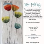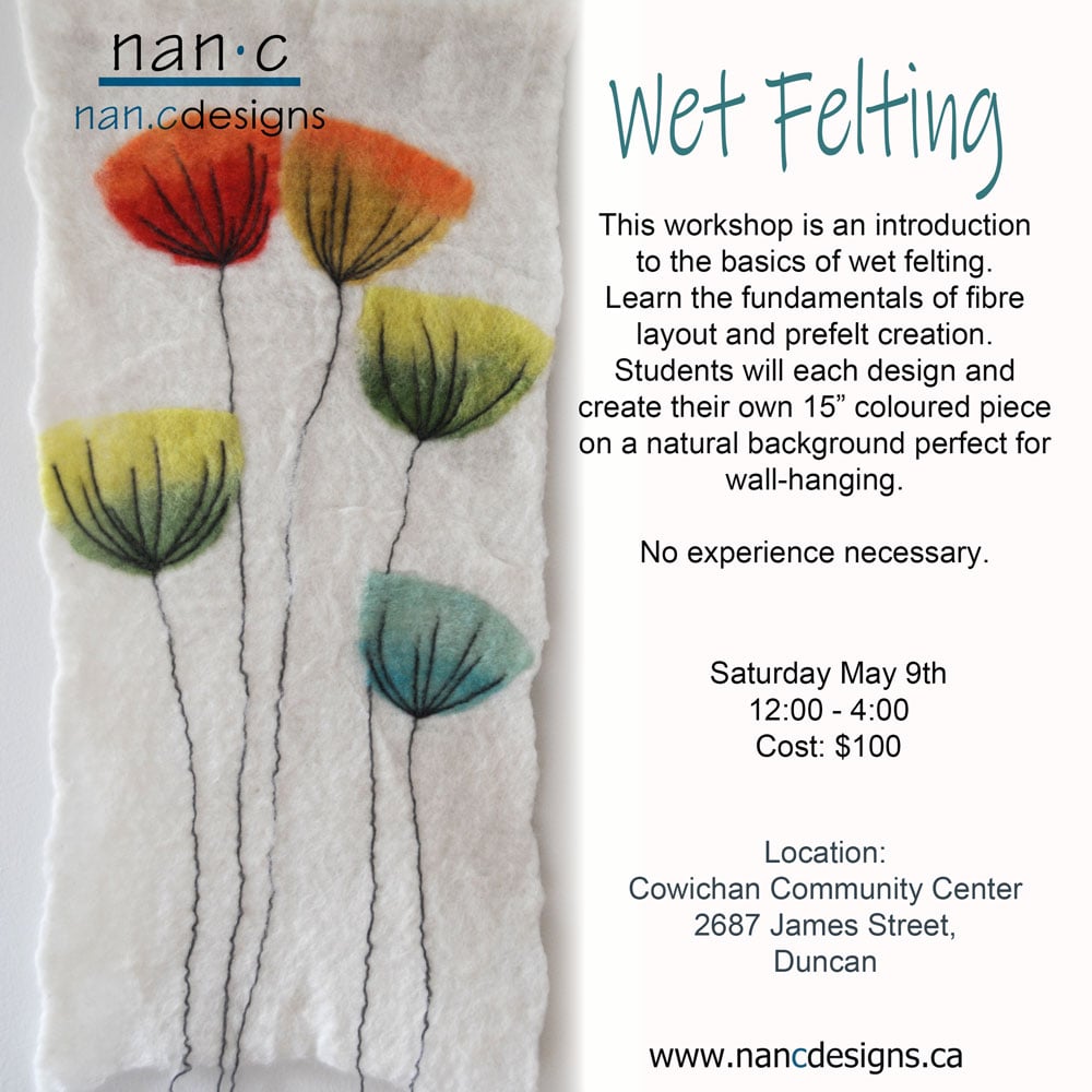 This workshop is an introduction to the basics of wet felting. Learn the fundamentals of fibre layout and prefelt creation. Students will each design and create their own 15" coloured piece on a natural background, perfect for wall-hanging. Various designs available, bring your ideas!